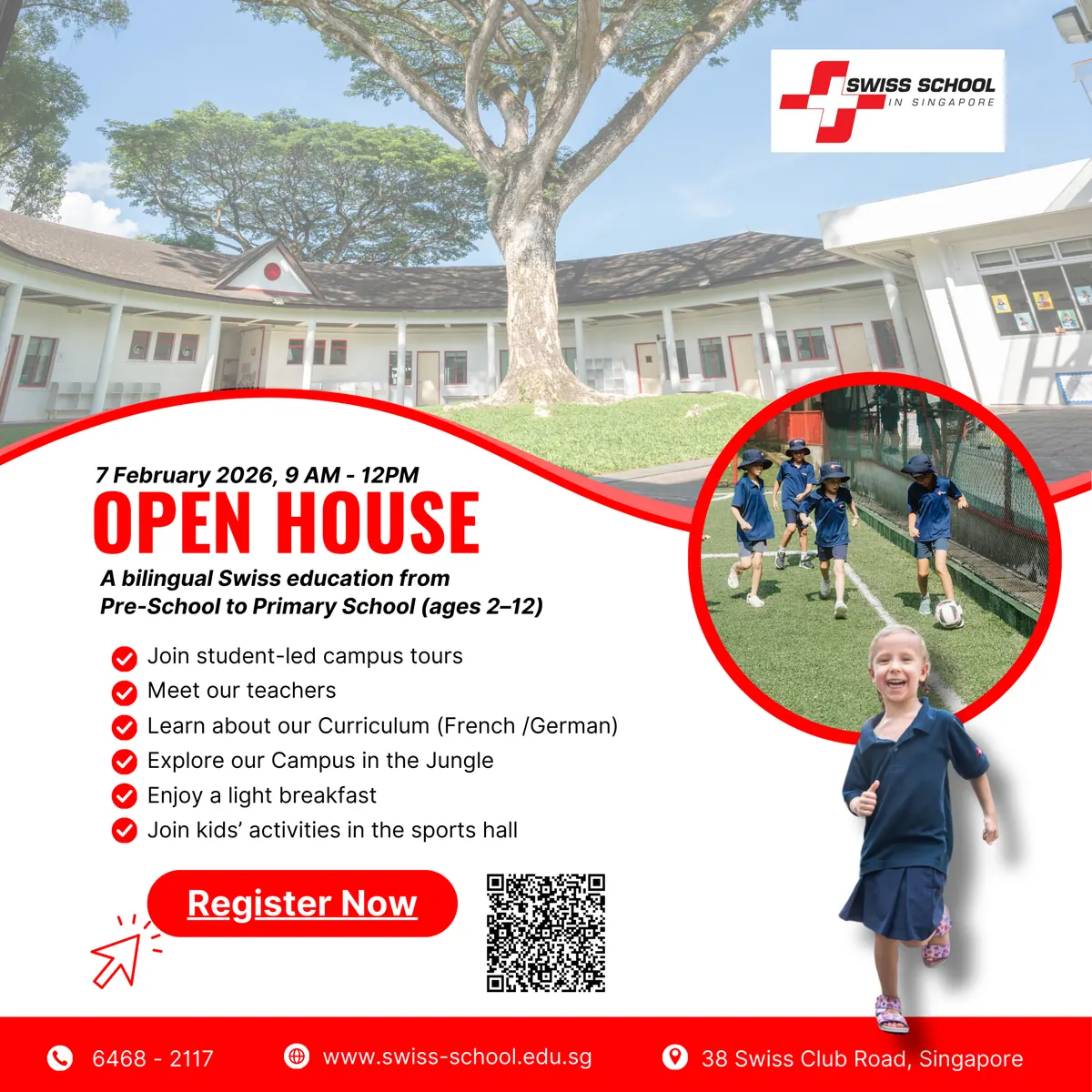 - –Beautiful green campus setting within Swiss Club grounds